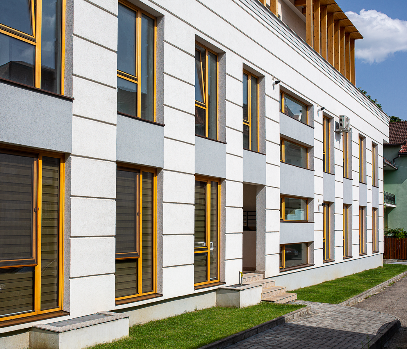 Situată în zona centrală a orașului, clădirea “B” este un exemplu minunat de îmbinare între arhitectura modernă și rigorile zonei. Aici ferestrele și ușile din lemn de molid lăcuite natur s-au încadrat cu succes în abordarea modernă a design-ului propus și a oferit locuitorilor clădirii oportunitatea de a se simți mai aproape de natură chiar în mijlocul orașului.