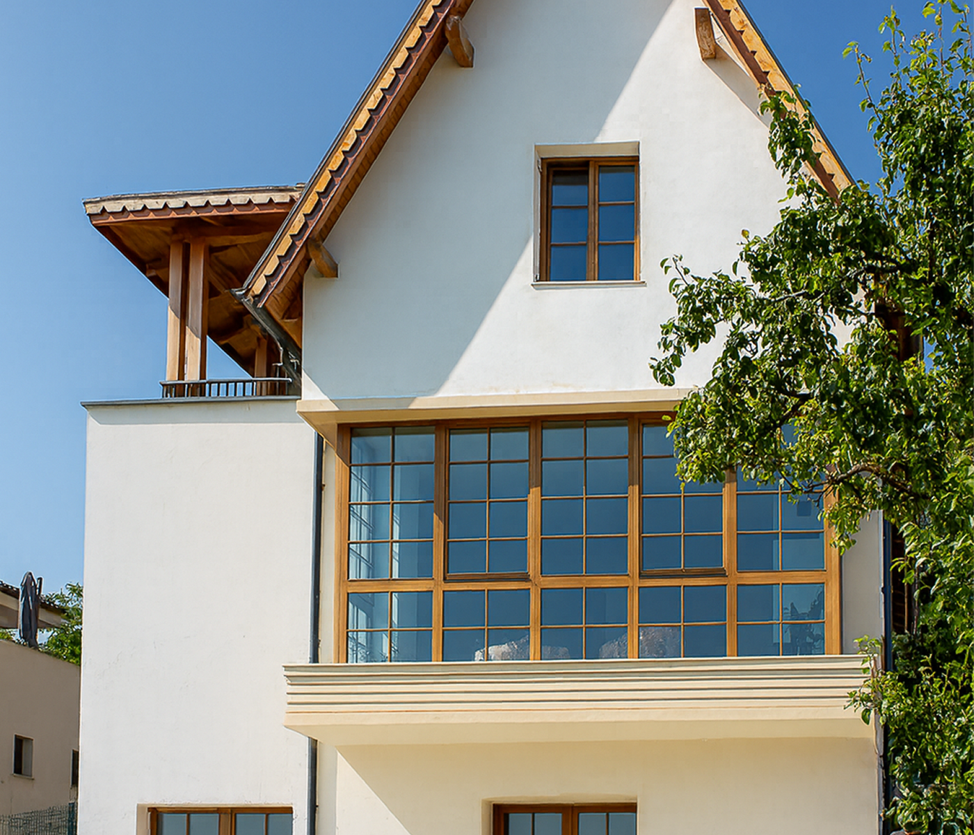 Familia “O” a ales pentru casa lor o serie de materiale naturale, dintre care lemnul ocupă un loc de cinste prin utilizarea la ferestre și uși și în mod vizibil la acoperiș. Ferestrele și ușile din lemn de molid, finisat culoare C13 au fost acompaniate la acest proiect de obloane de lemn din același material și finisaj.